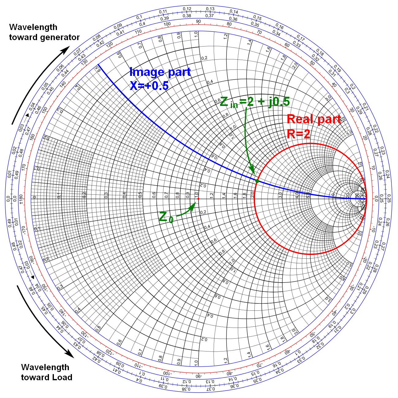 若負載阻抗不是剛好50 ohm的話,那麼傳輸線長度的增減會改變反射率,由於反射率的公式當初在推導的時候,是以負載端當作長度為零,因此傳輸線長度增長的話,表示長度是往訊號源延伸,因此阻抗點會順時針旋轉,轉一圈是1/2個波長,轉半圈是1/4波長。
